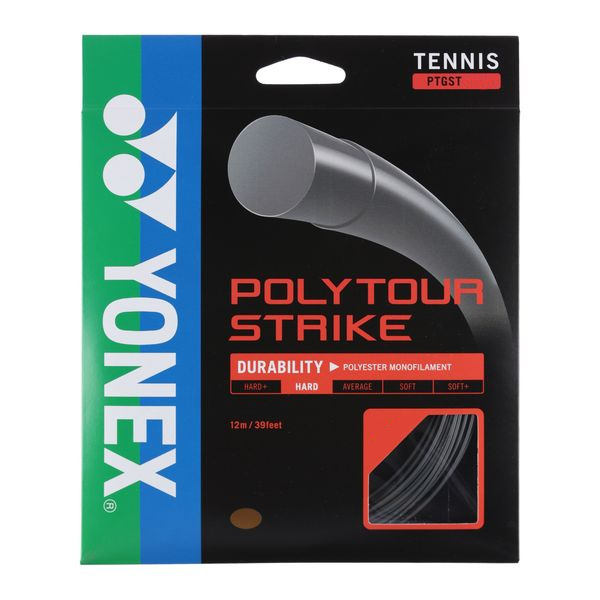 Yonex Poly Tour Strike - wyjątkowo trwały, poliestrowy naciąg o dużej mocy. Monofilament na bazie polimerów zachowuje dłuższą wydajność przy minimalnym spadku sprężystości nawet podczas dynamicznych wymian na korcie. Okrągły przekrój i gładka powierzchnia pozwala graczom atakować z dużą siłą i rotacją. Ze względu na większą trwałość oraz niski poziom utraty naprężeń (w porównaniu do tradycyjnych strun poliestrowych) polecany jest dla tenisistów często zrywających naciągi.